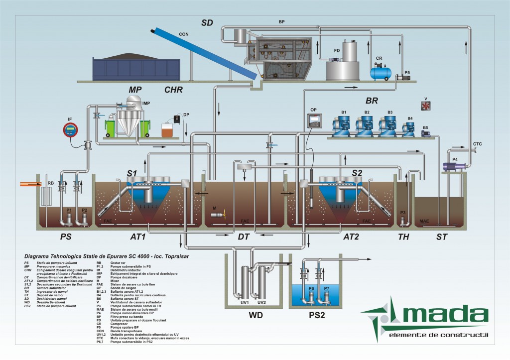 Pre-epurarea mecanica grosiera are loc in gratarul rar al statiei de pompare de unde apa uzata este pompata in treapta de pre-epurare mecanica fina. Apa pre-epurata mecanic ajunge in zona de denitrificare care este conectata prin orificii cu bazinul cu namol activat. In zona de denitrificare apa este mentinuta in miscare de un mixer submersibil si tot in aceasta zona se realizeaza descompunerea anaeroba a compusilor azotului din apa uzata. Poluarea organica este eliminata biologic din apa uzata in zona cu namol activat, aerata cu un sistem de aerare cu bule fine. O conditie a bunei desfasurari a acestor procese este asigurarea conditiilor optime de viata a biomasei combinata cu stabilizarea aeroba a namolului.Apa uzata epurata este separata de namolul activ in decantorul secundar iar apa rezultata din decantare este descarcata prin conducta de evacuare in receptor. Inainte de evacuarea in receptor efluentul statiei de epurare poate fi dezinfectat. De pe fundul decantorului secundar namolul activ este pompat in zona de denitrificare ca si namol de recirculare. Spuma de la suprafata decantorului secundar si grasimile din cilindrul de linistire sunt indepartate in mod automat. Din namolul de recirculare o fractie ajunge in ingrosatorul de namol ca si namol de in exces. Pomparea namolului din ingrosatorul de namol in bazinul de stocare namol se realizeaza in mod automat cu ajutorul sondei de suspensii. Bazinul de stocare namol este aerat cu un sistem de aerare cu bule medii, ce contribuie la o mai buna omogenizare si stabilizare a namolului si previne fermentarea acestuia. Sursa de aer pentru depozitul de namol este asigurata de o suflanta. Namolul din depozitul de namol poate fi fie vidanjat periodic sau poate fi deshidratat. Sursa de aer pentru zona de oxidare-nitrificare este pozitionata deasupra bazinului de denitrificare si consta in suflante ce alimenteaza cu aer statia de epurare printr-un sistem de conducte. Aerarea procesului biologic este controlata in mod automat cu o sonda de oxigen. Compusii fosforului vor fi indepartati prin precipitare chimica. Debitul influent in statia de epurare va fi monitorizat cu ajutorul unui debitmetru.