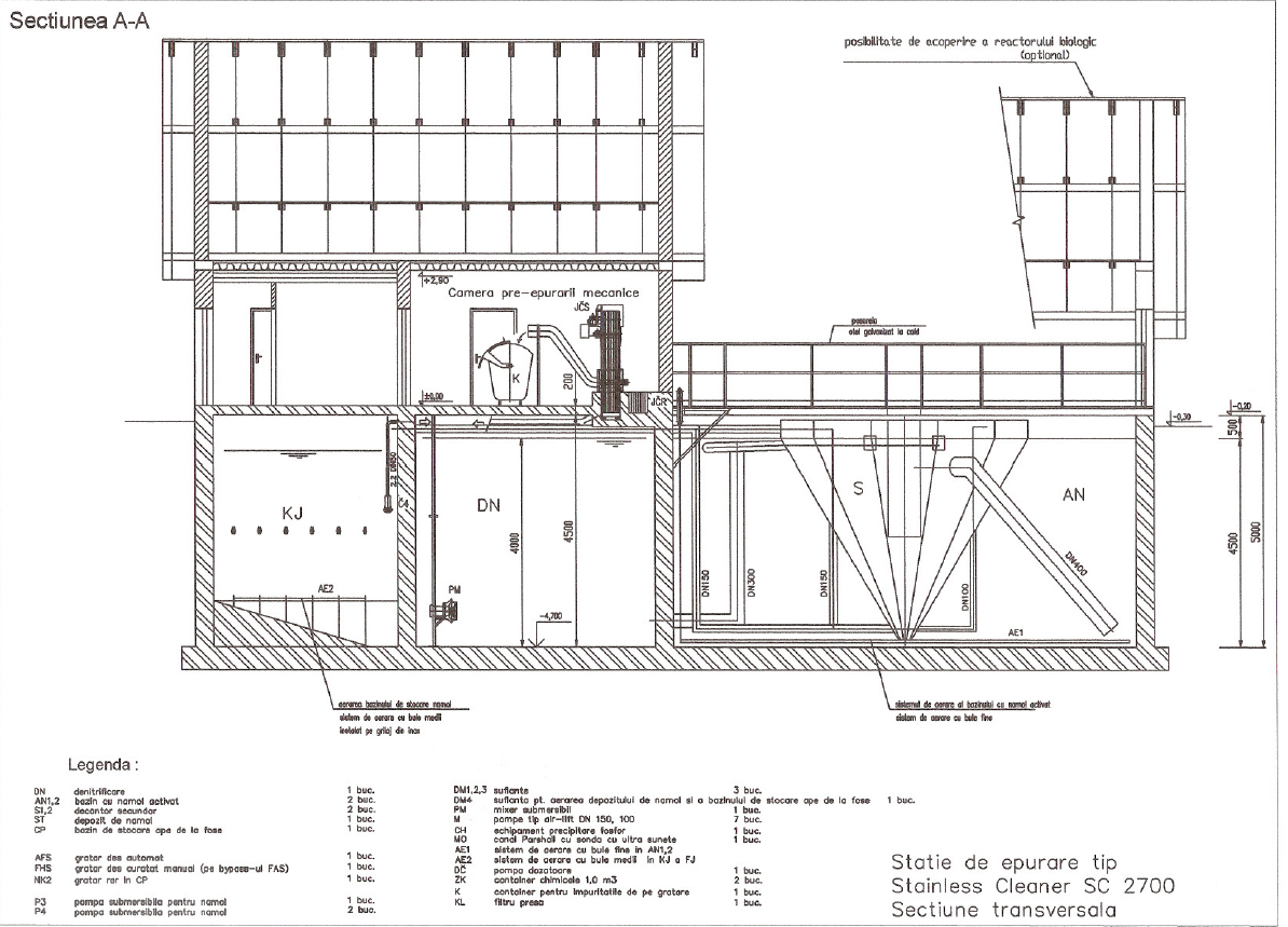 • Toate echipamentele statiei de epurare sunt montate intr-un singur bazin de beton compartimentat. Echipamentele submersate sunt realizate din inox EN 1.4301 iar pasarelele si balustradele sunt realizate din otel galvanizat la clad